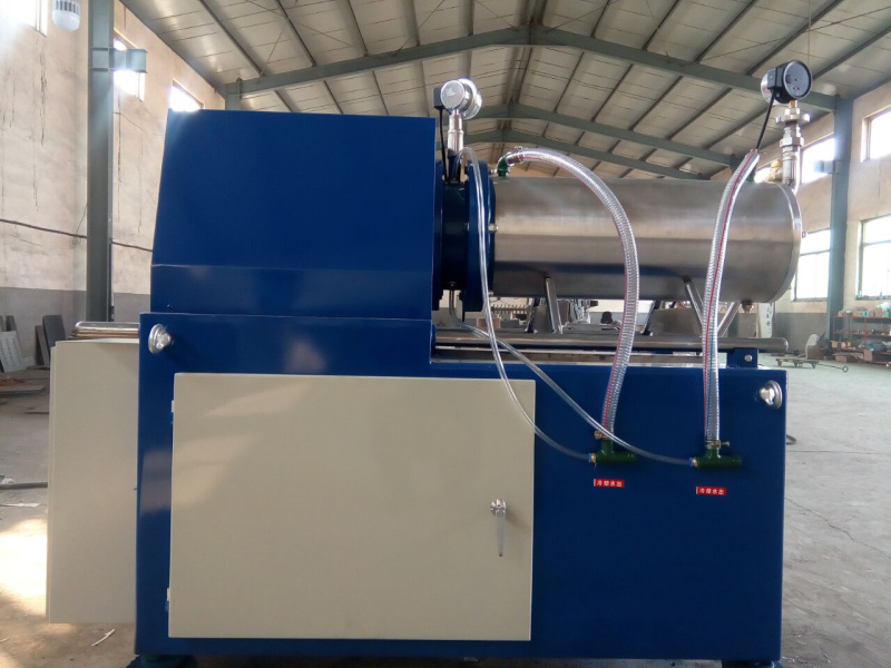 臥式砂磨機(jī)是利用料泵將經(jīng)過攪拌機(jī)預(yù)分散潤濕處理后的固-液相混合物料輸入筒體內(nèi),物料和筒體內(nèi)的研磨介質(zhì)一起被高速旋轉(zhuǎn)的分散器攪動,從而使物料中的固體 微粒和研磨介質(zhì)相互間產(chǎn)生更加強(qiáng)烈的碰撞、摩擦、剪切作用,達(dá)到加快磨細(xì)微粒和分散聚集體的目的。研磨分散后的物料經(jīng)過動態(tài)分離器分離研磨介質(zhì),從出料管流出。臥式砂磨機(jī)特別適合分散研磨粘度高而粒度要求細(xì)的產(chǎn)品。